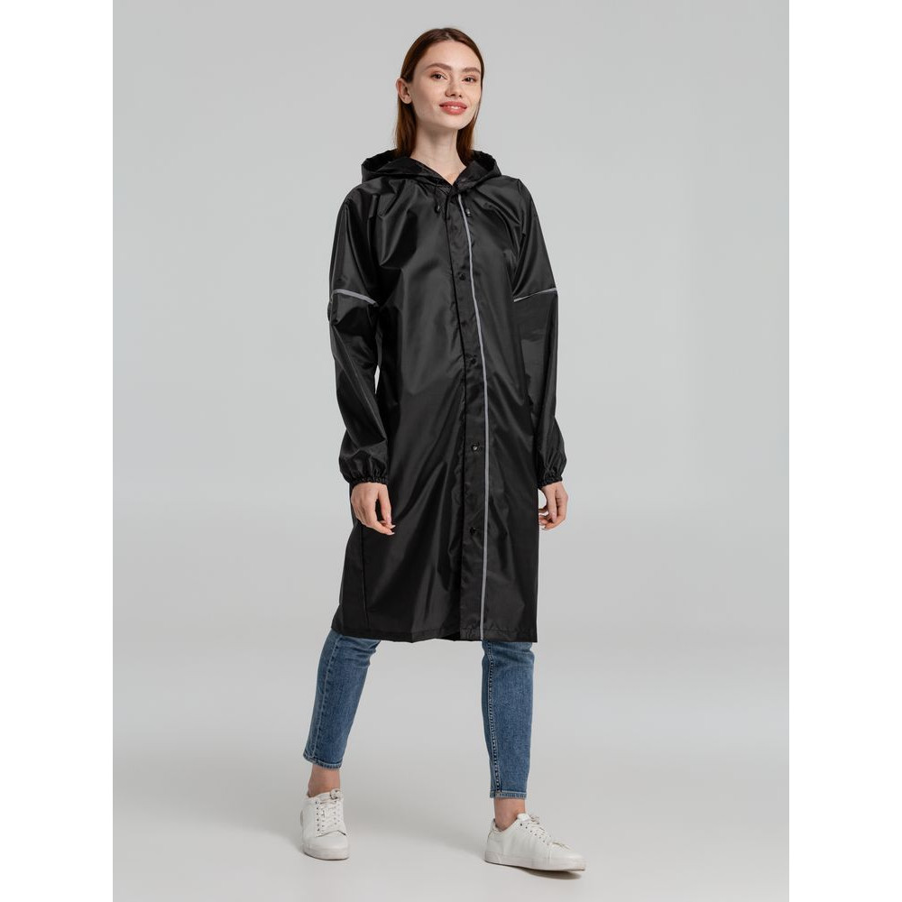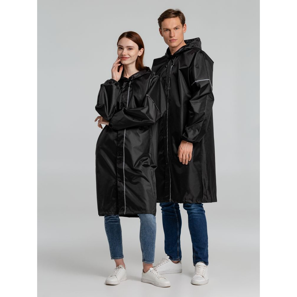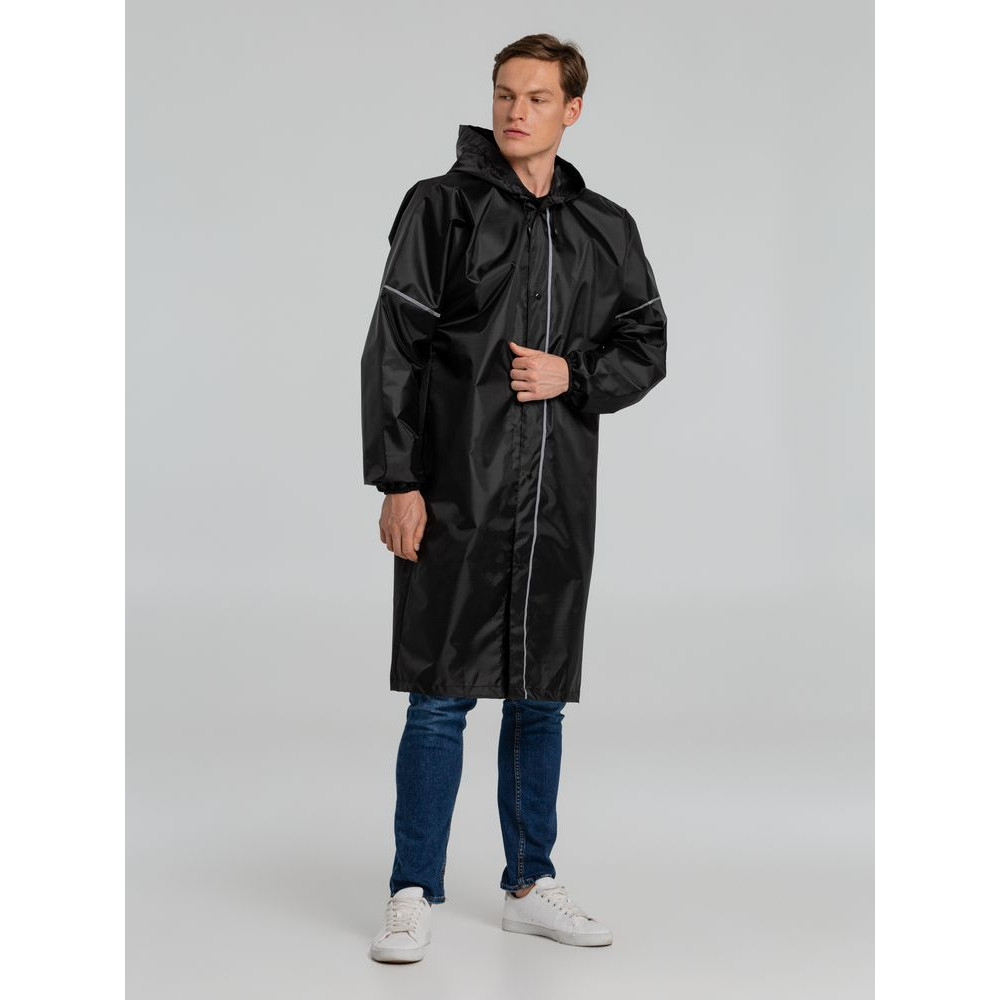 Плащ-дождевик из ткани оксфорд на кнопках с капюшоном. Световозвращающие элементы на рукавах и планке позволяют быть замеченным в темное время суток.