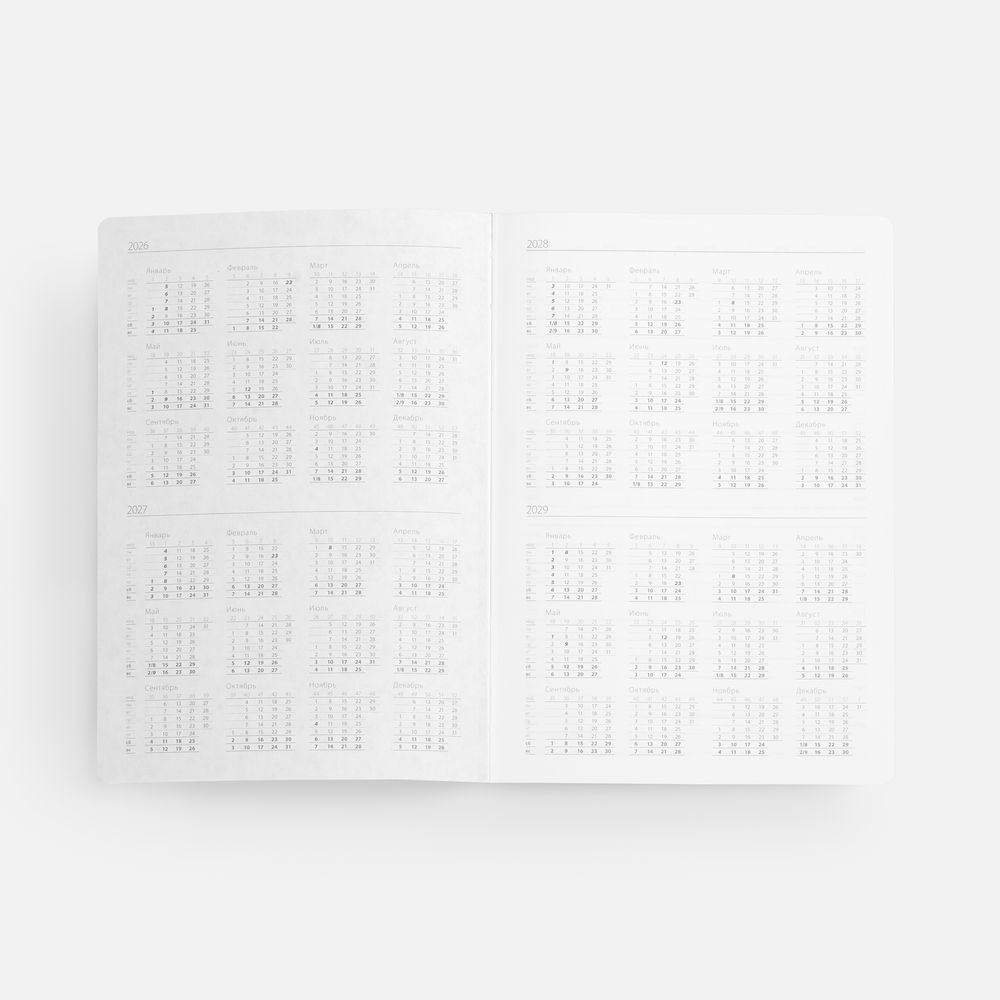 Гибкая обложка выполнена из материала Soft Touch, серый СС и Latte, серый СС (внутренняя часть обложки). Внутри корешка — специальное место для крепления ручки размером до 15х1 см.