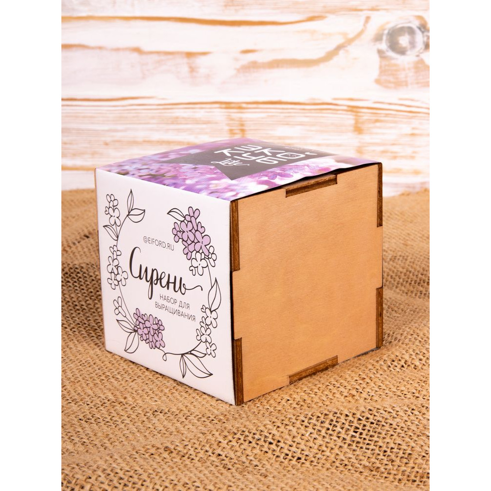 В наборе: деревянный куб, бумажный стаканчик, питательный грунт, семена, вермикулит.