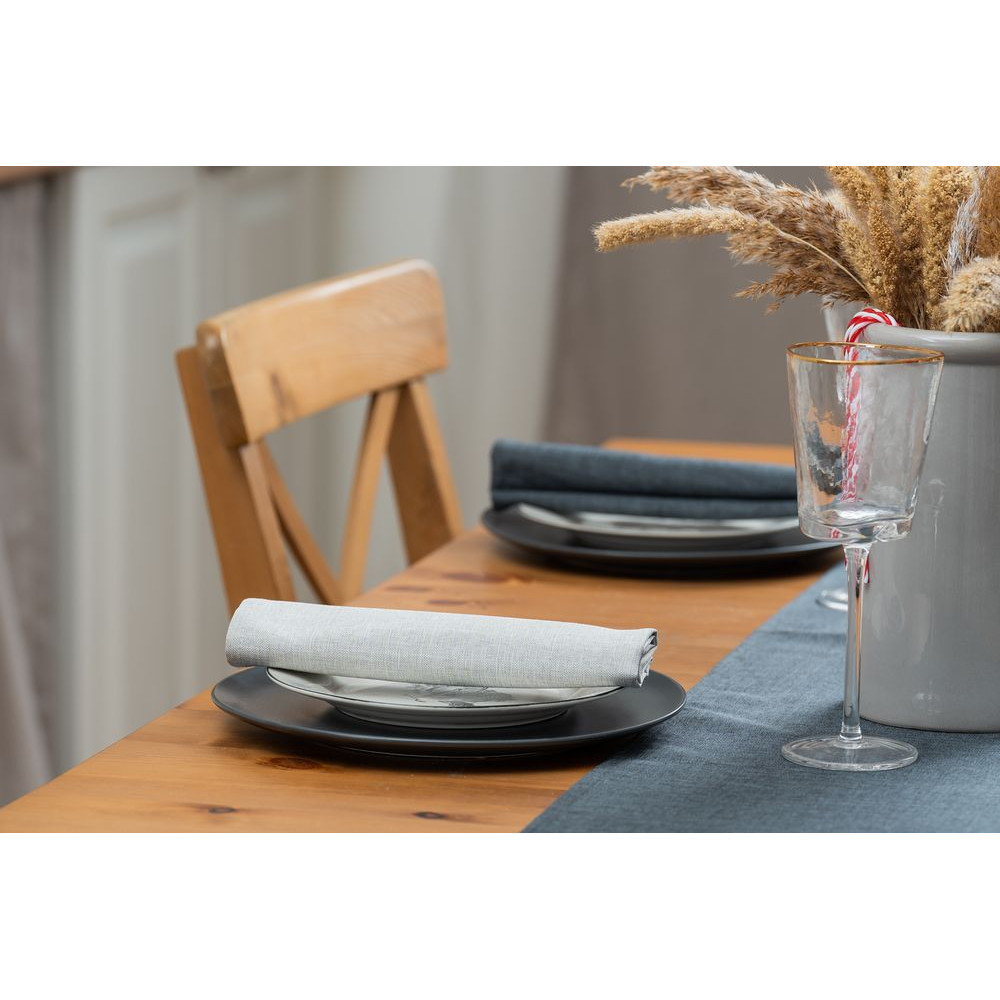 Износостойкая ткань, имитирующая лен, обработана пропиткой от грязи и воды, что делает ее применение для кухни и дома практичным, а уход — легким.