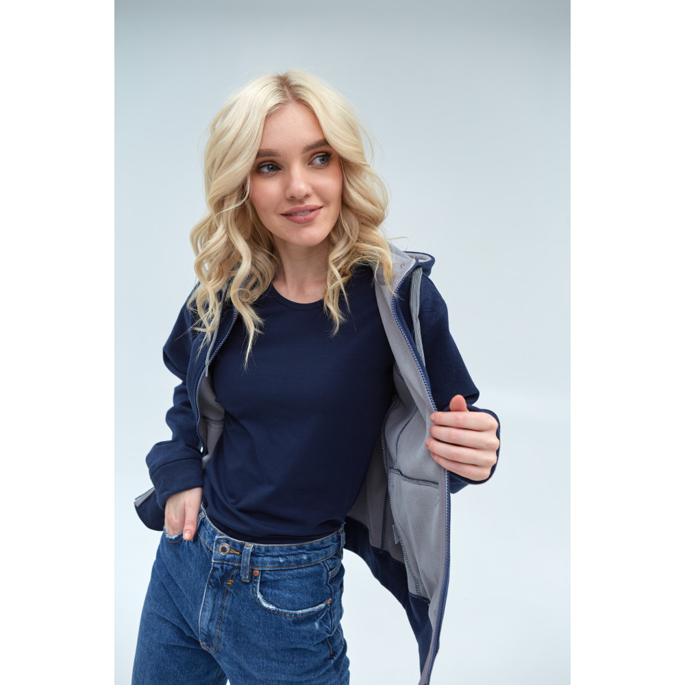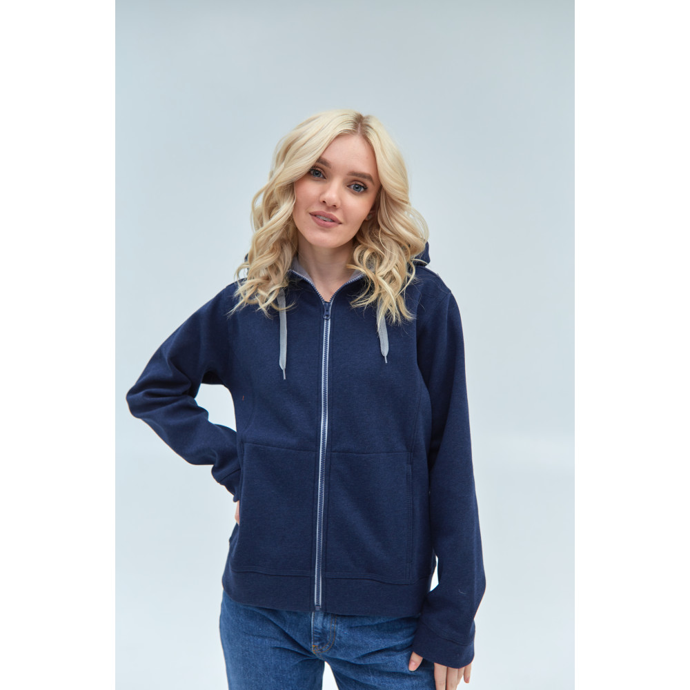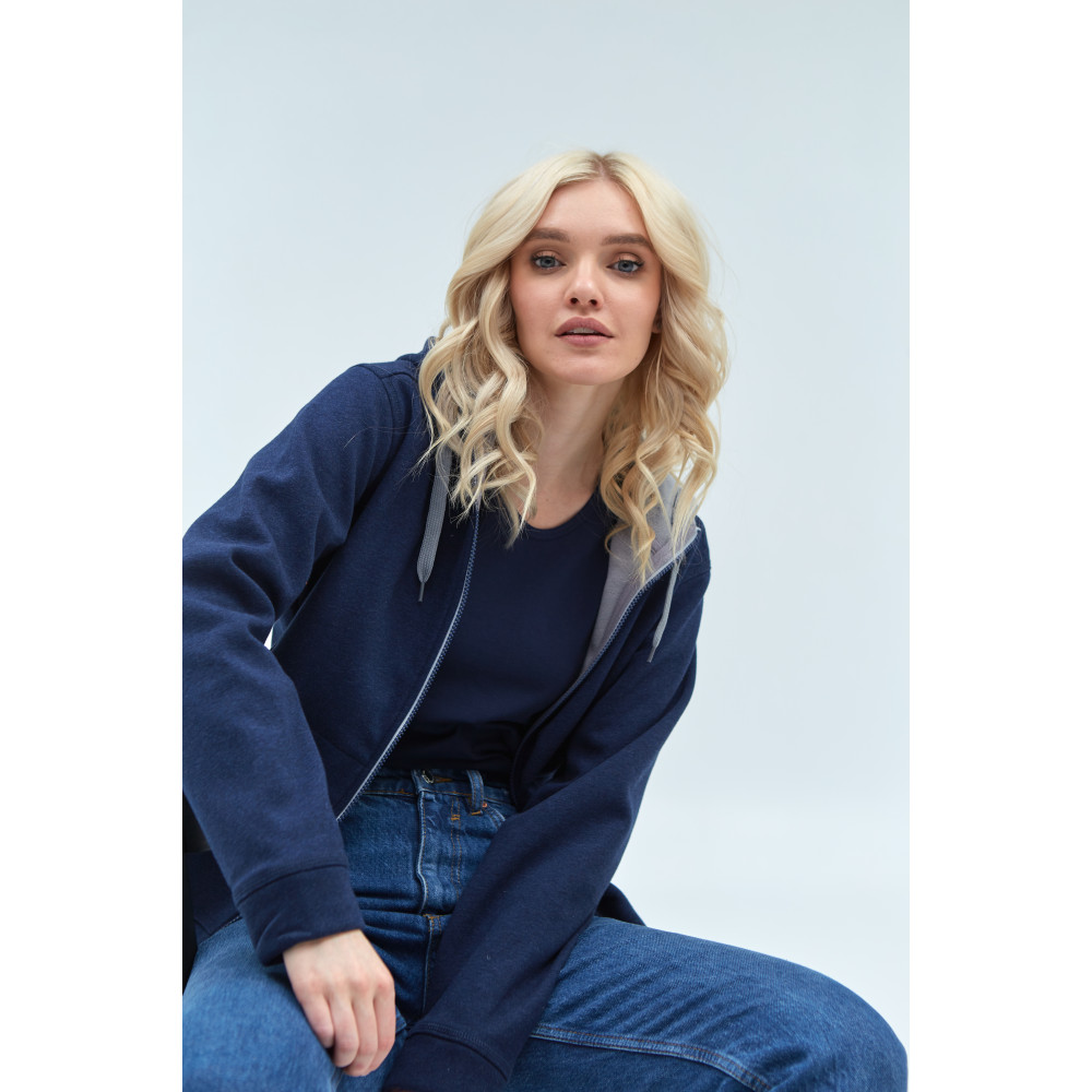 Женская толстовка прямого силуэта с капюшоном комфортной глубины, втачным рукавом, прорезным карманов и застежкой на контрастную молнию. Капюшон дополнен плоским шнурком для регулировки прилегания, манжет и низ изделия выполнены из основного полотна.