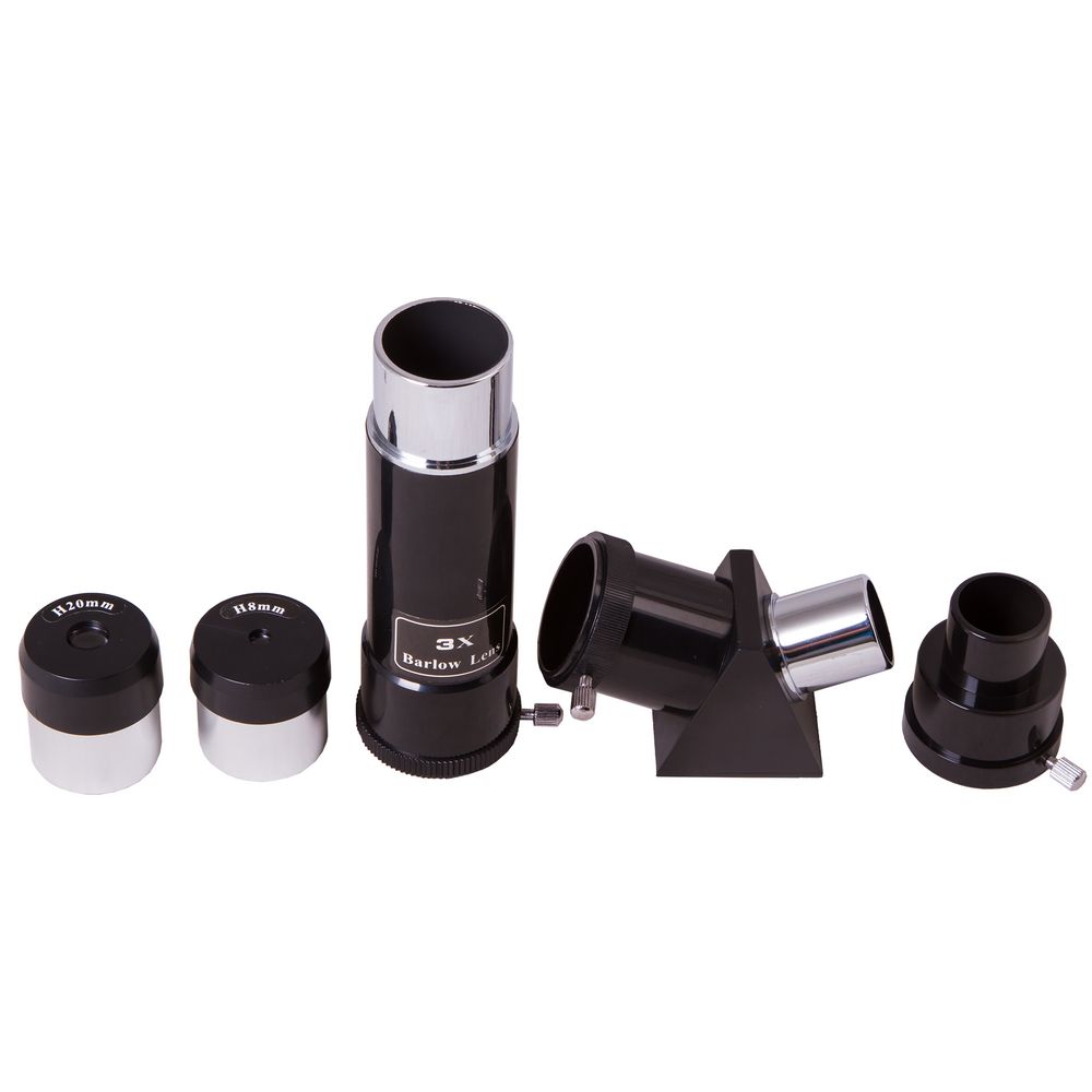 - В комплекте окуляры: H8 мм (45x), H20 мм (18x); линза Барлоу 3х